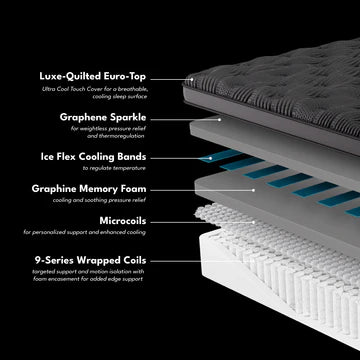 Experience unparalleled luxury and comfort with the Black Diamond Hybrid Mattress, designed for a restful night’s sleep. The CoolTouch Ultra Cool Cover and Flex Cooling Bands keep you cool for 12+ hours by drawing heat away, while high-density Cool Titanium Memory Foam provides body-contouring support and weightless pressure relief. The 9-Series Wrapped Coil System boosts airflow, offers targeted support, and ensures edge-to-edge comfort, allowing you to enjoy a rejuvenating night sleep.